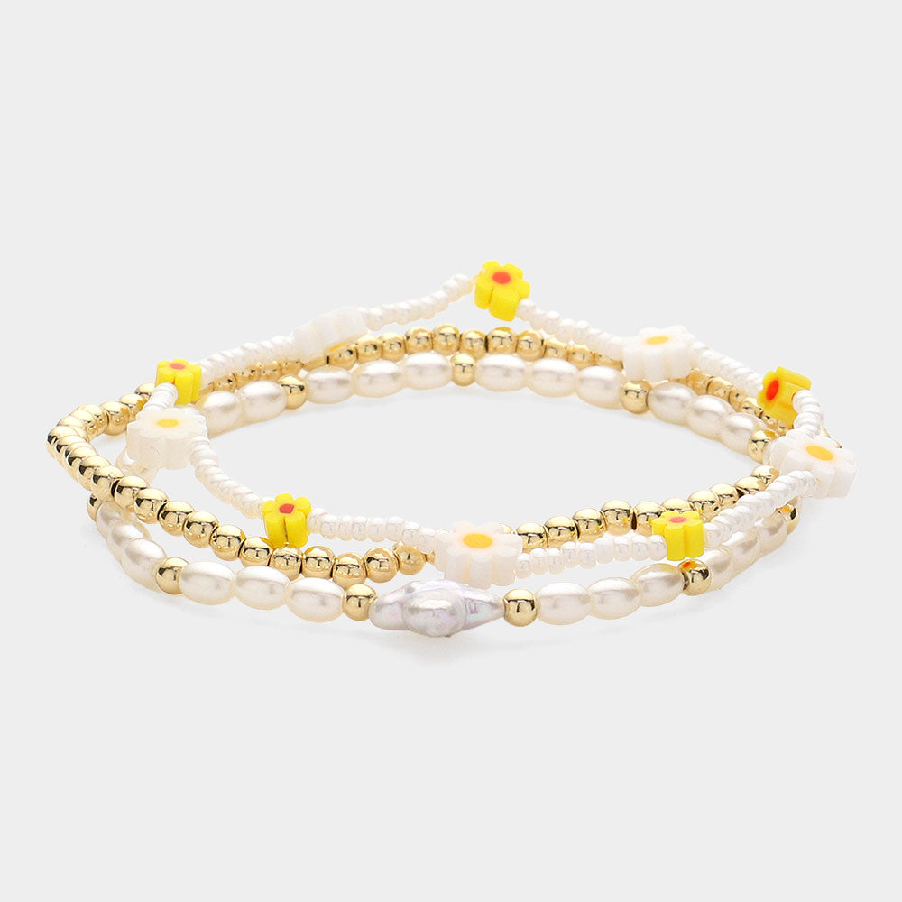 iLLASPARKZ 3PCS - Mother Of Pearl Flower Quatrefoil Pointed Beaded Multi Layered Bracelets