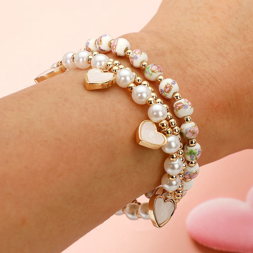 iLLASPARKZ 3PCS - Mother of Pearl Heart Charm Floral Ceramic Ball Pearl Beaded Stretch Multi Layered Bracelets