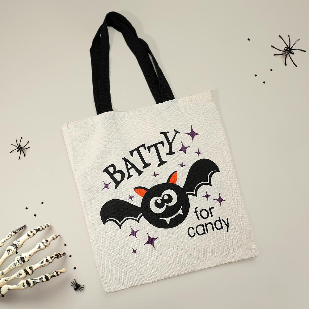 Get batty for treats with this cute Halloween tote bag! Featuring a smiling bat and purple stars, this durable canvas bag is perfect for kids to collect candy in spooky style.