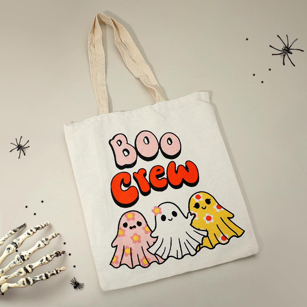 Join the Boo Crew with this adorable Halloween tote bag! Featuring three cheerful ghosts in flower costumes, this durable canvas bag is perfect for kids to collect treats on spooky night adventures.