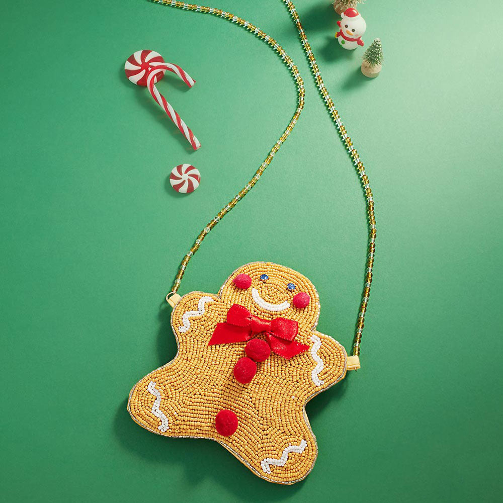 Charming gingerbread man-shaped crossbody bag with festive details and whimsical appeal. A perfect novelty accessory for holiday outfits, seasonal events, or gifting during the Christmas season.