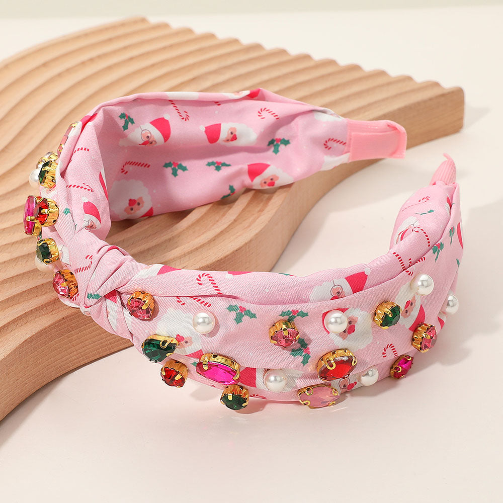 Add festive flair with this padded headband featuring a playful Santa and candy cane print, adorned with colorful gemstones and pearl accents. Perfect for holiday parties, photo shoots, and gifting.