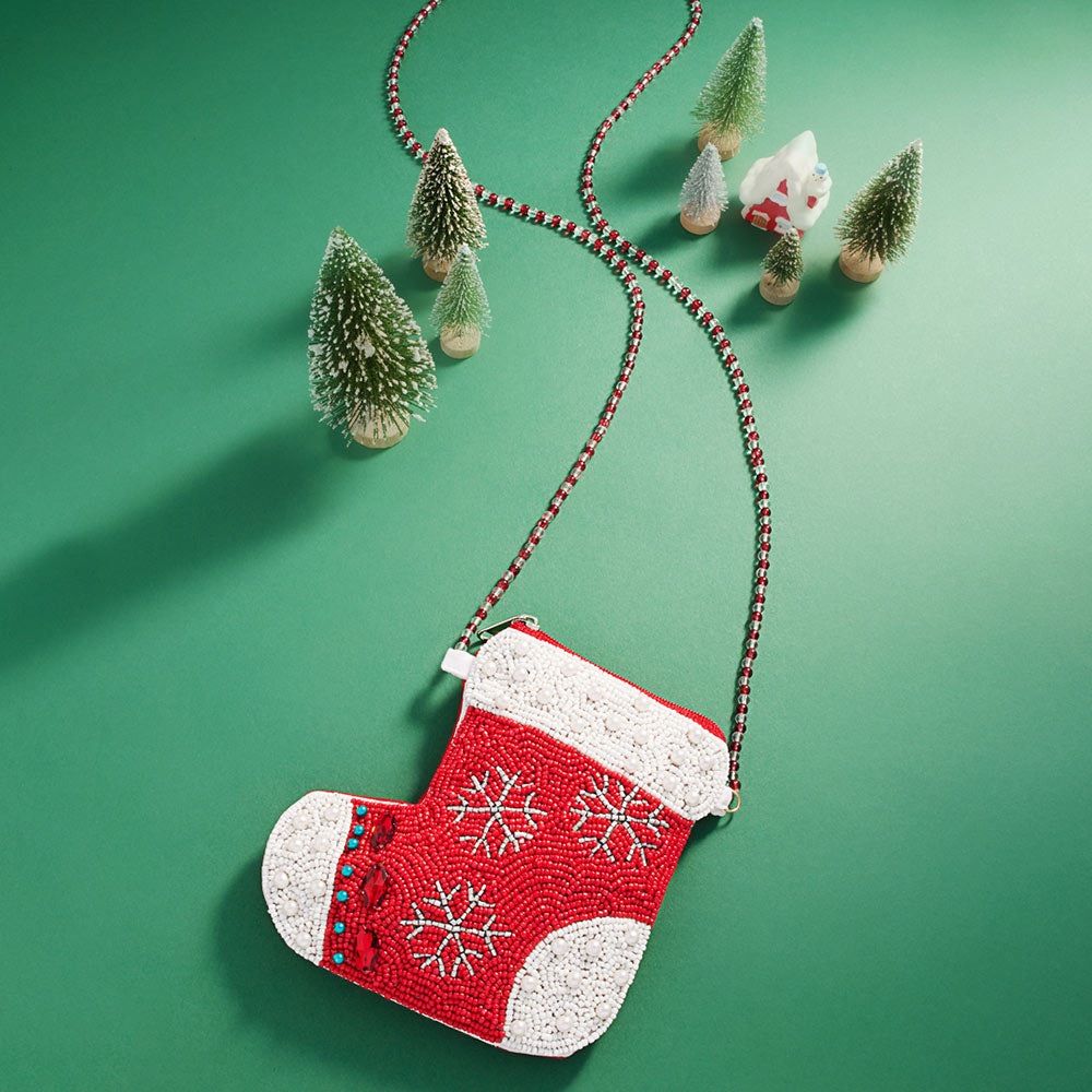 Charming holiday-themed crossbody bag shaped like a Christmas stocking, adorned with beaded snowflakes and festive accents. Perfect for seasonal outings, parties, or as a unique holiday gift.