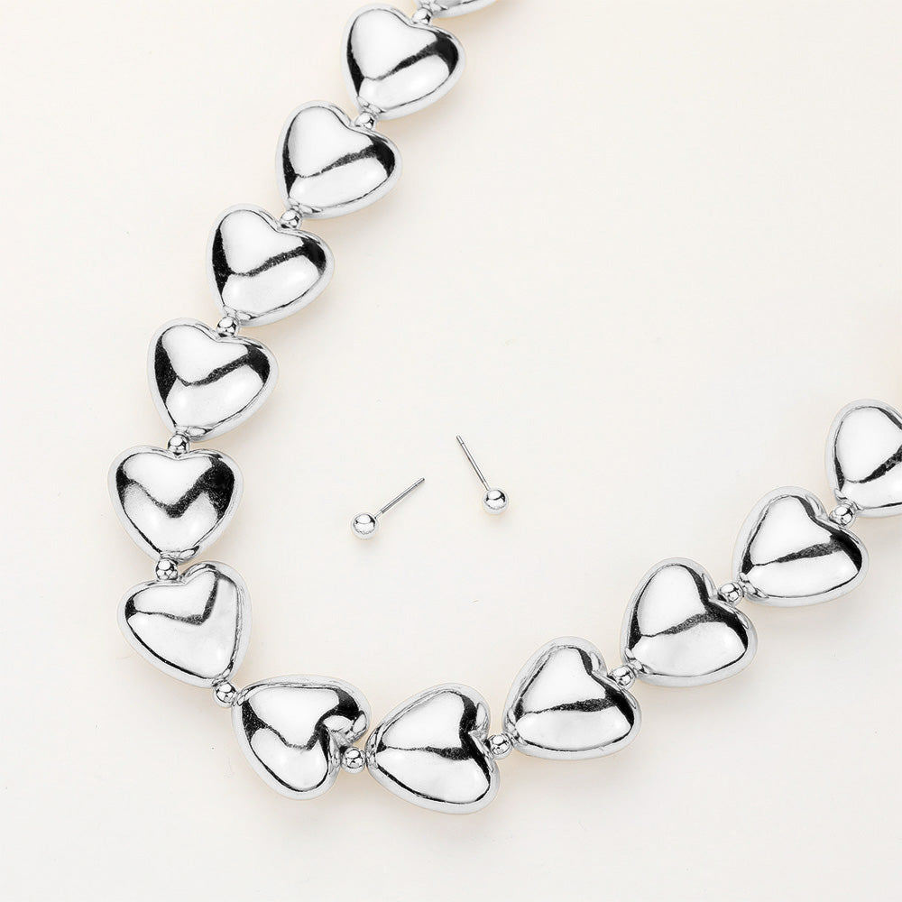 Statement necklace featuring bold heart links and matching stud earrings. A perfect accessory to add a romantic and stylish touch to your everyday or evening look.