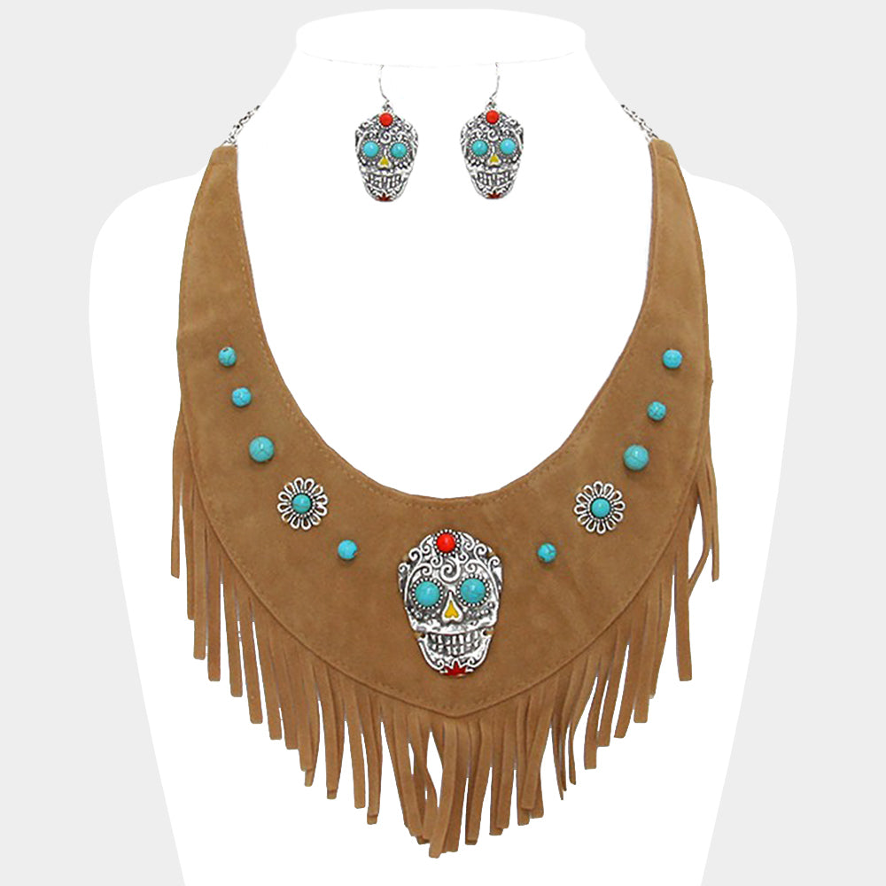 iLLASPARKZ Day of the Dead Mexican Sugar Skull Suede Fringe Bib Necklace