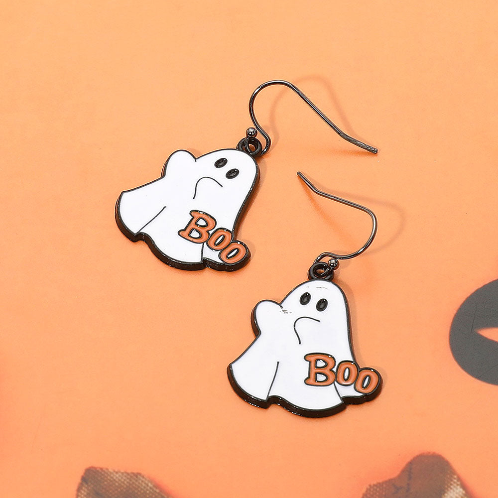 Fun ghost-shaped earrings with a playful “Boo” detail, perfect for Halloween festivities. Lightweight and charming for spooky season outfits.