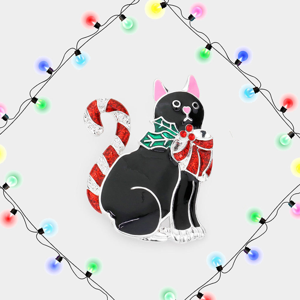 Add playful holiday charm with this festive cat brooch, featuring a candy cane tail, wrapped gift, and holly detail. A delightful accessory for cat lovers and holiday enthusiasts alike—perfect for parties or seasonal gifting.