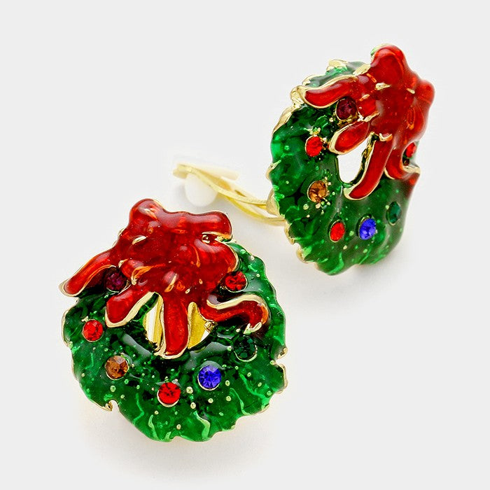 iLLASPARKZ Enamel Christmas wreath clip on earrings