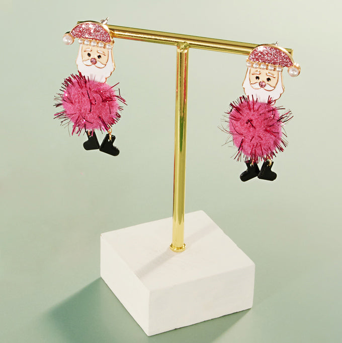 Spread holiday joy with these Santa pom-pom earrings, featuring a cheerful Santa figure with a fluffy textured body, glittery hat, and dangling boots. Perfect for festive events, these fun earrings make a playful statement and bring seasonal charm to any winter outfit.