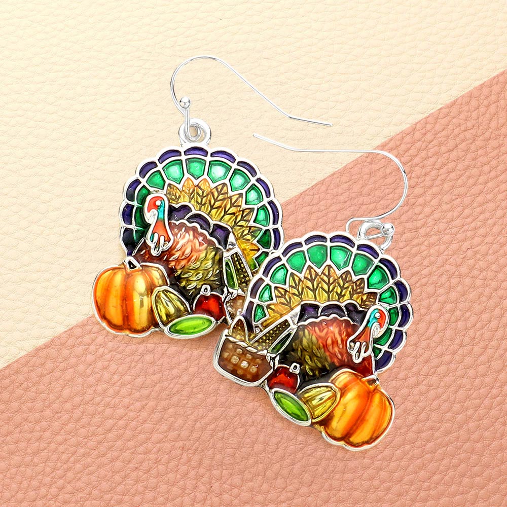 Celebrate the season with these festive Thanksgiving turkey earrings. Featuring a harvest scene with pumpkins and produce, they’re perfect for adding holiday cheer to your outfit or gifting for fall events.