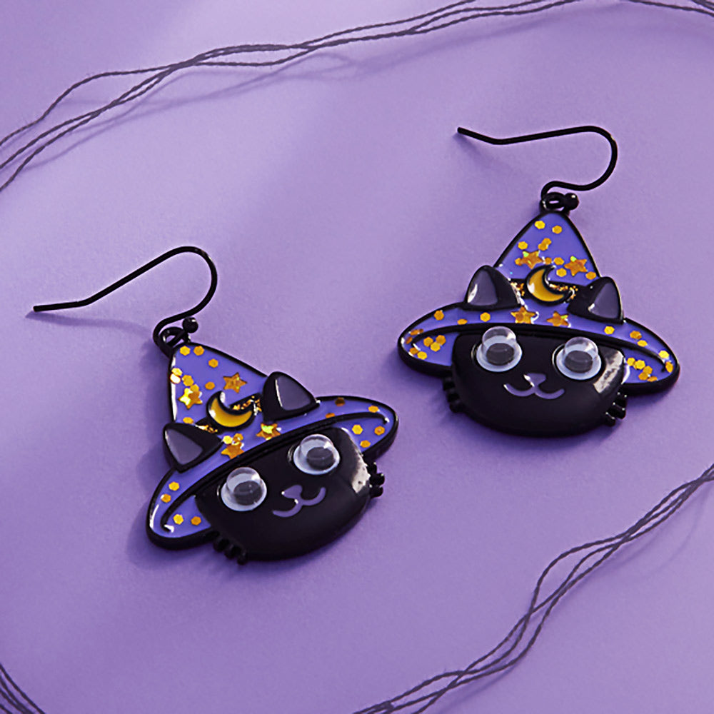 Celebrate Halloween with these adorable black cat earrings featuring googly eyes and a starry witch hat. A playful and festive touch to your seasonal outfit or costume, perfect for parties and spooky fun.