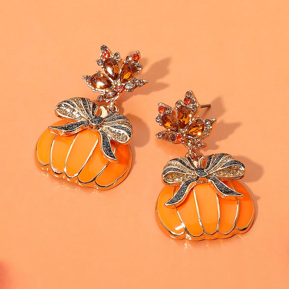 Celebrate the season with festive pumpkin drop earrings featuring sparkling bows and leaf accents. Ideal for autumn events, Halloween, or Thanksgiving gatherings. These playful yet elegant earrings add seasonal charm to your look.