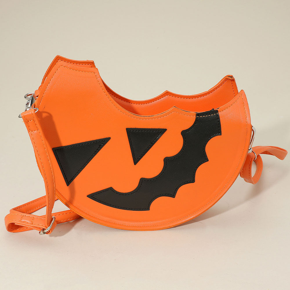 Add spooky charm to your outfit with this jack-o’-lantern crossbody bag, shaped like a pumpkin slice with bold face detailing and an adjustable strap—perfect for Halloween festivities!