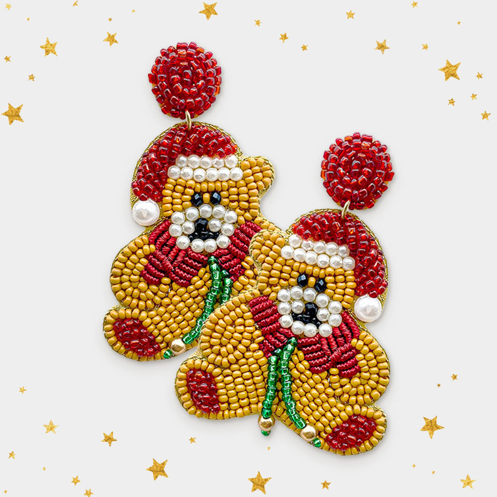 Celebrate the season with these beaded bear earrings featuring a cheerful holiday outfit. Fun and whimsical accessory for Christmas events, gifting, or festive outfits. Eye-catching and full of charm.