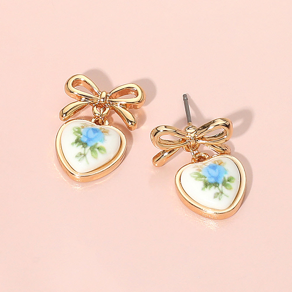 Charming drop earrings with heart-shaped floral accents and dainty bow detail—perfect for adding a romantic, vintage-inspired touch to everyday outfits or special occasions.