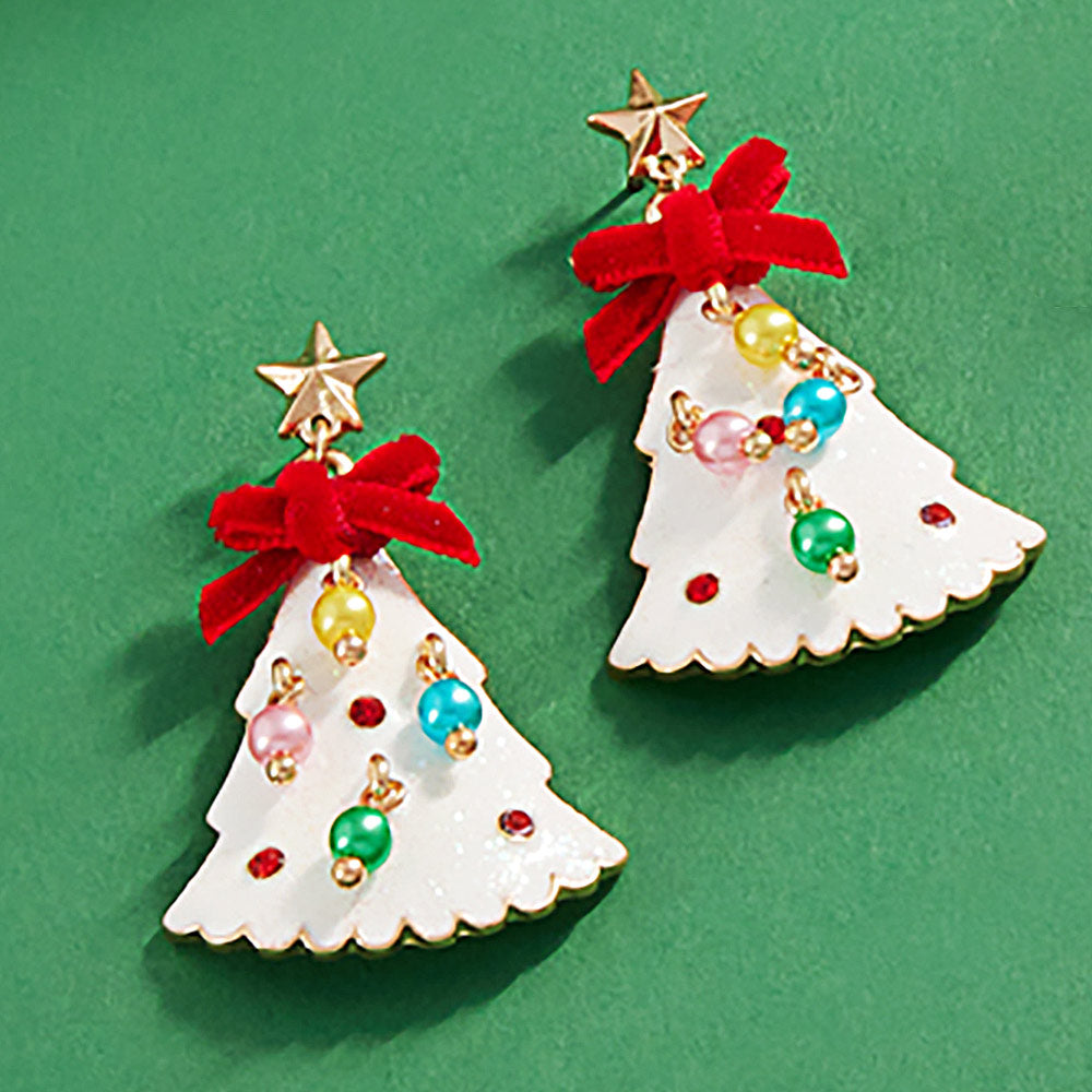 Celebrate the season with whimsical Christmas tree drop earrings, accented with colorful beads, star tops, and charming bow details. A fun and festive accessory to enhance your holiday style.