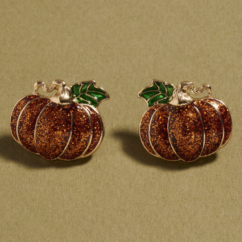Charming pumpkin-shaped stud earrings featuring a sparkling glitter finish and leaf detail. Ideal for fall outfits, Halloween events, or festive seasonal style. Playful and eye-catching accessory.