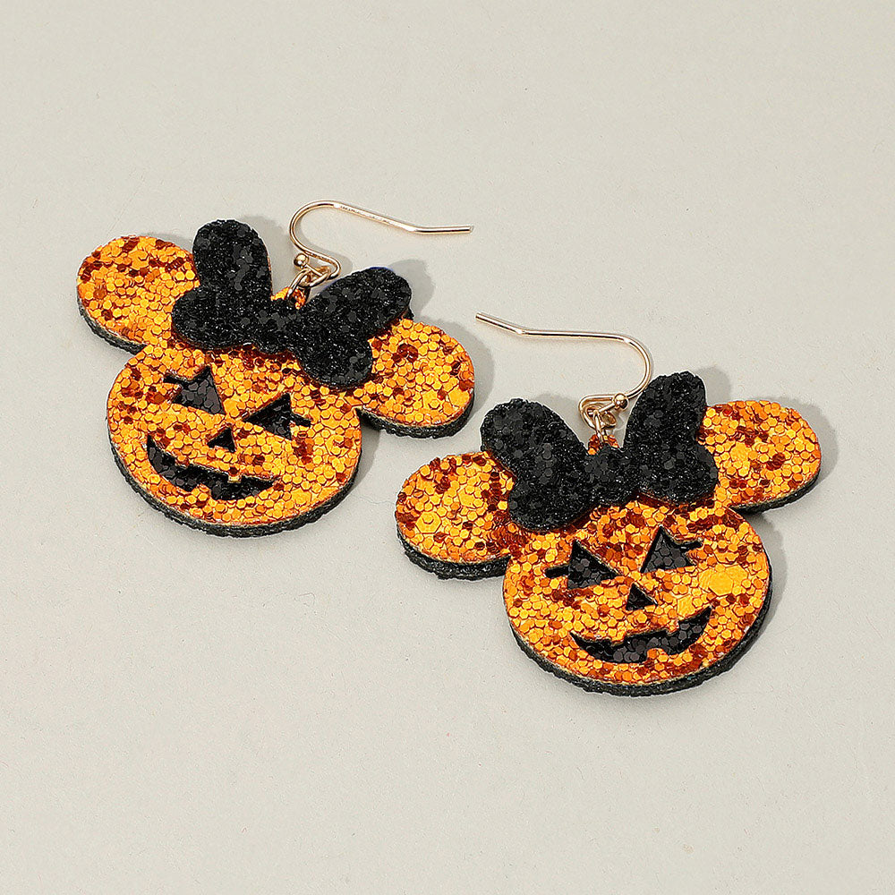 Celebrate Halloween with fun glitter earrings shaped like jack-o'-lanterns with mouse ears and a bow. These festive earrings are perfect for spooky parties, costumes, or adding playful charm to your look.