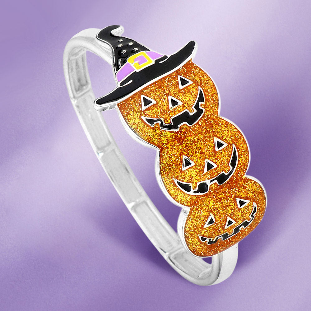 Celebrate spooky season in style with this Halloween-themed bracelet featuring a sparkling stack of pumpkins topped with a witch hat. A fun accessory perfect for parties, events, or festive everyday wear.