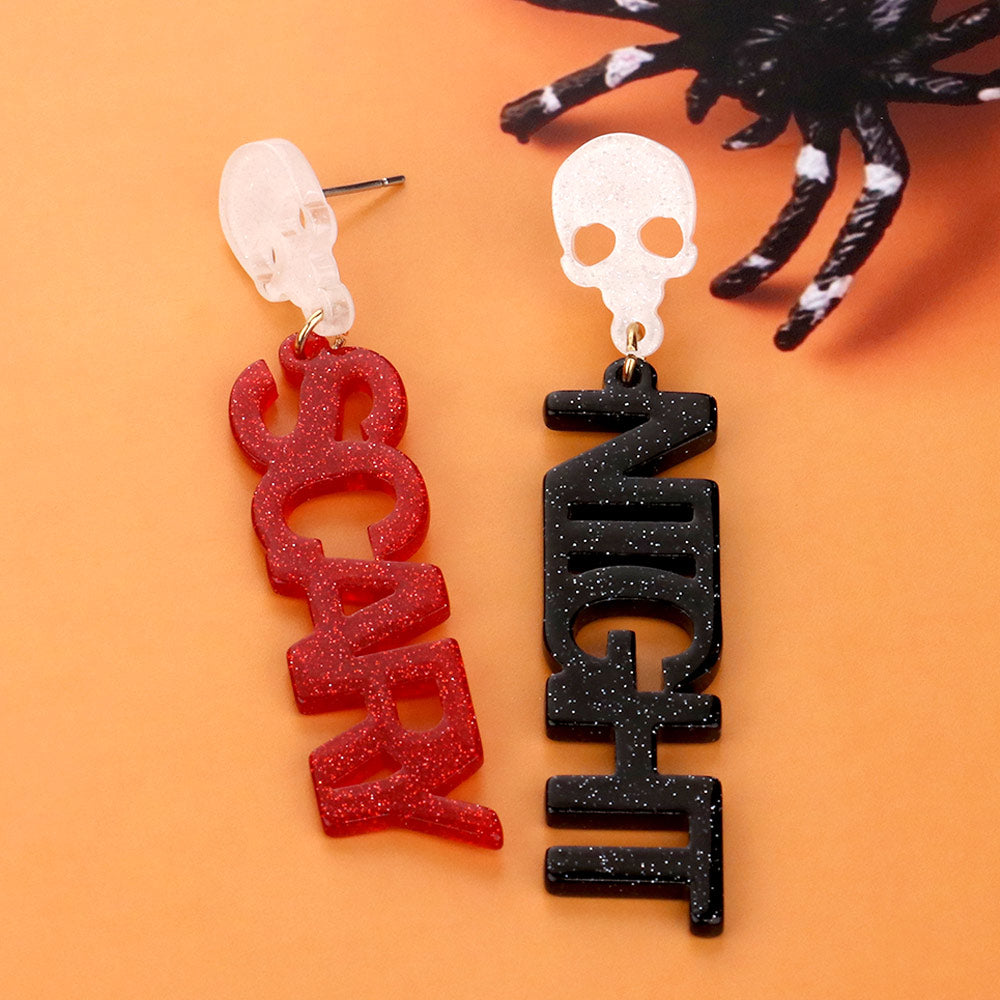 Add spooky charm to your Halloween outfit with these mismatched "Scary" and "Night" drop earrings, featuring bold lettering and skull accents. Perfect for parties, costumes, or festive seasonal looks.