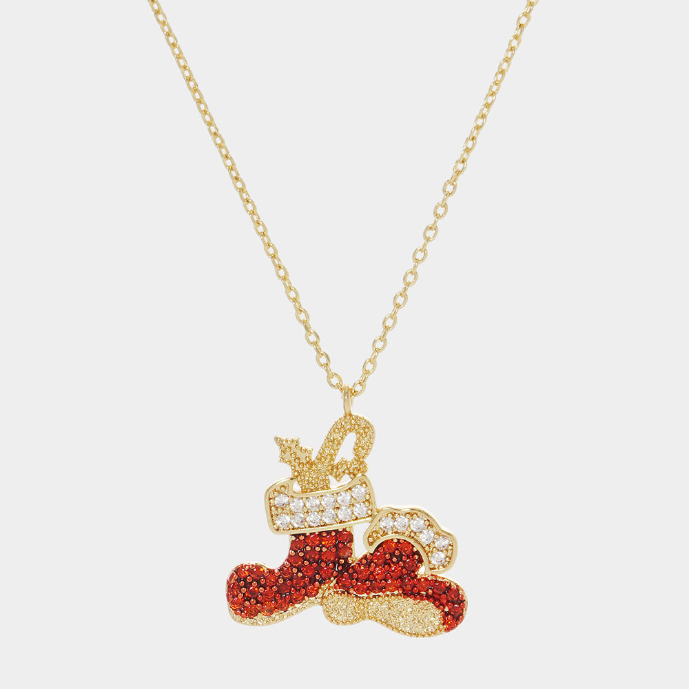Festive necklace featuring a glittering boot pendant adorned with shimmering stones and holiday detailing. Perfect for Christmas parties, seasonal gifting, or adding festive charm to your winter wardrobe.