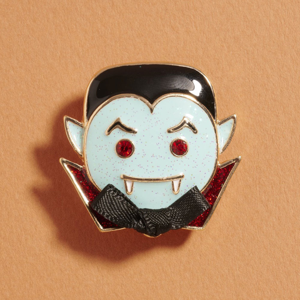 Show off spooky charm with this Dracula face Halloween pin, complete with glimmering red eyes, fangs, and a tiny bow tie. A playful and festive accent for Halloween outfits, hats, or bags.