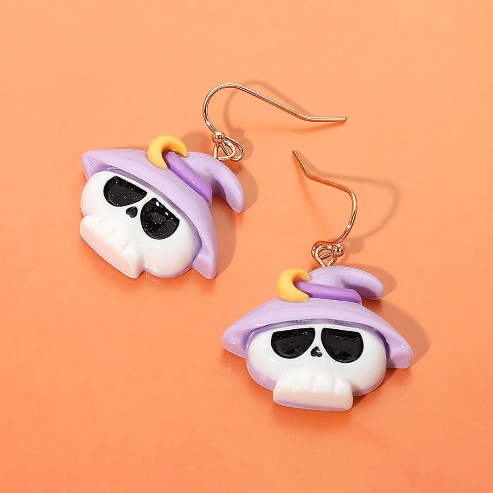 Add charm to your spooky style with these purple witch skull Halloween earrings, featuring a white skull with black eyes and a pastel witch hat. Lightweight and fun—perfect for Halloween parties, costumes, or playful fall fashion.