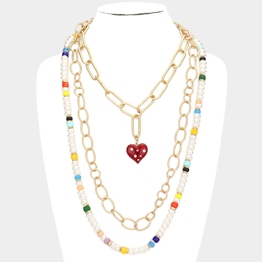 iLLASPARKZ Heart Pendant Accented Pearl Resin Beaded Triple Layered Necklace