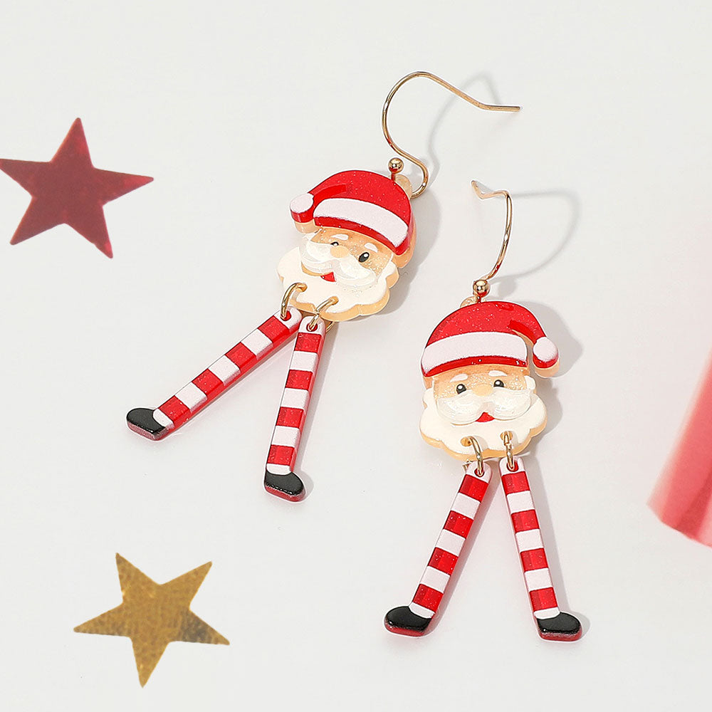 Fun holiday earrings featuring jolly Santa Claus faces with striped dangling legs. A cheerful and whimsical accessory perfect for Christmas parties, gift exchanges, or festive winter looks.