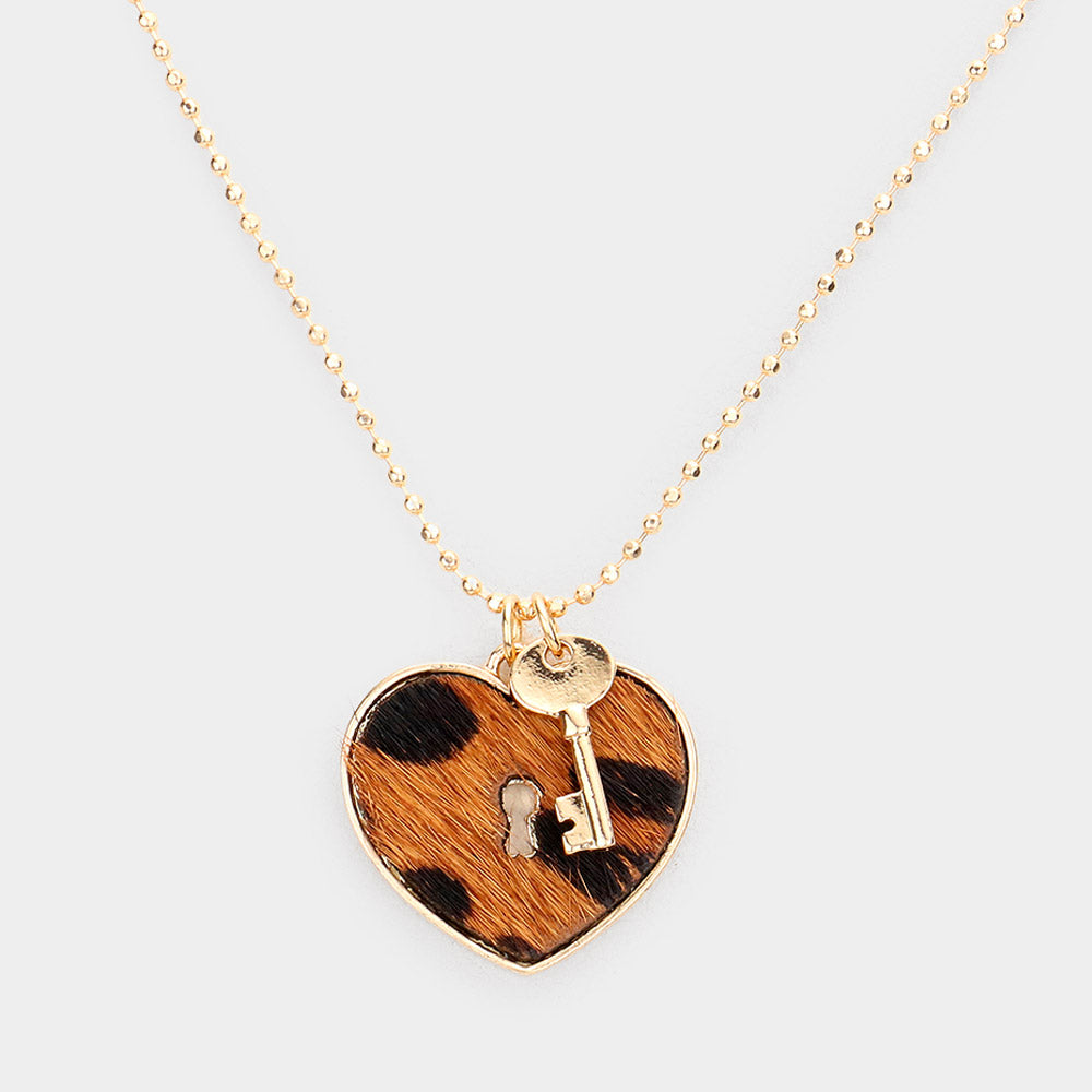 iLLASPARKZ Leopard Patterned Genuine Leather Calf Heart Lock Metal Key Pendant Necklace