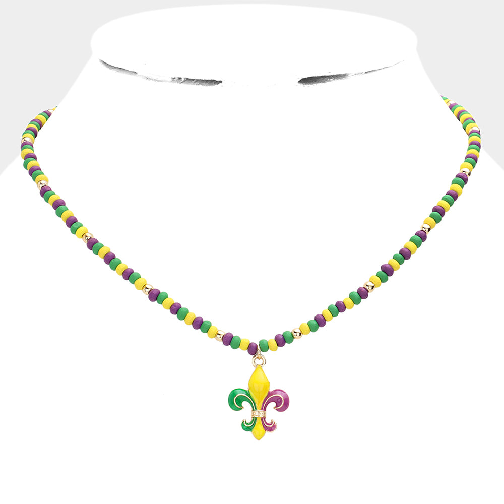 iLLASPARKZ Mardi Gras Fleur de Lis Pendant Wood Ball Necklace