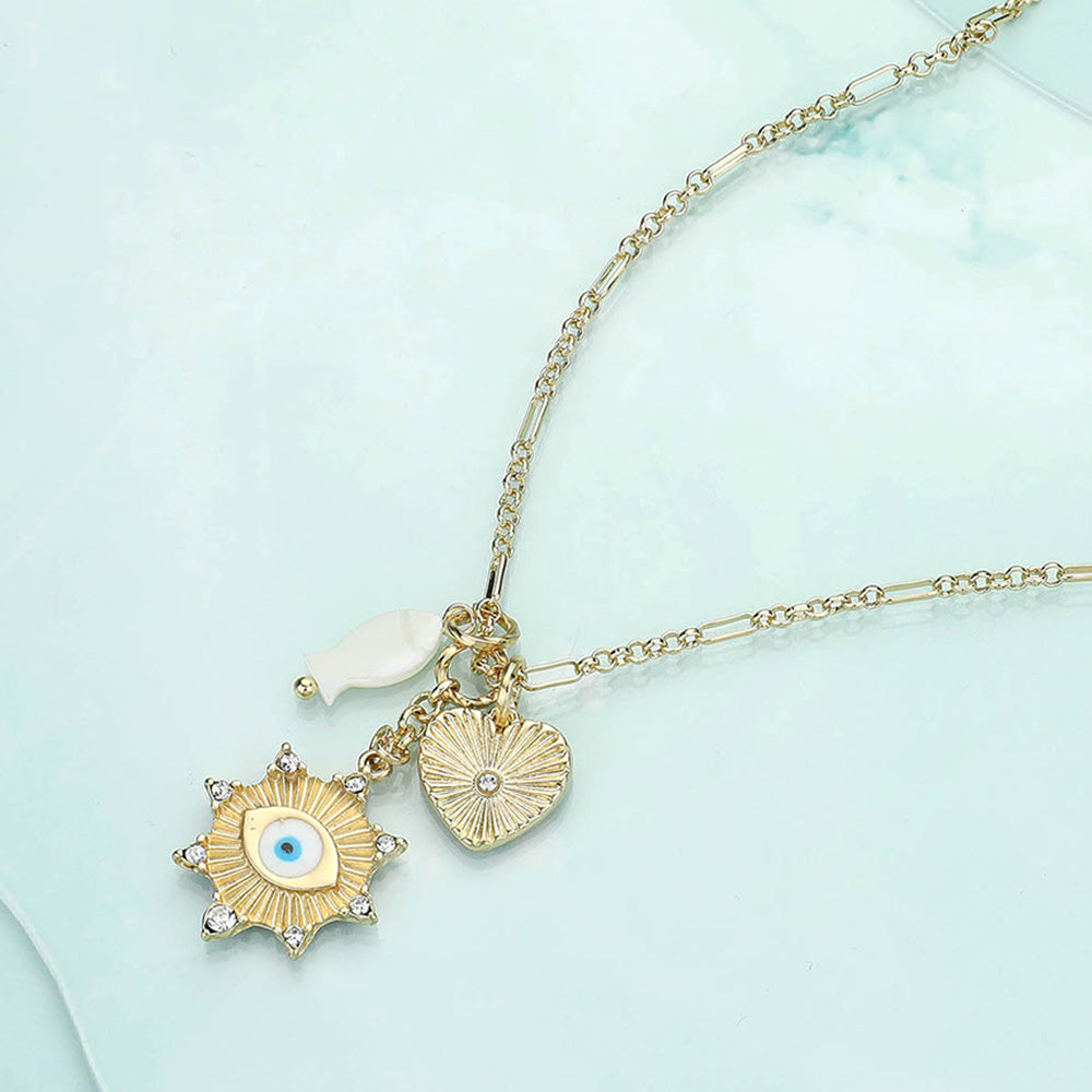 Elegant gold necklace featuring evil eye, heart, and fish charms. A symbolic and stylish accessory ideal for layering or gifting, blending meaning with modern coastal charm.