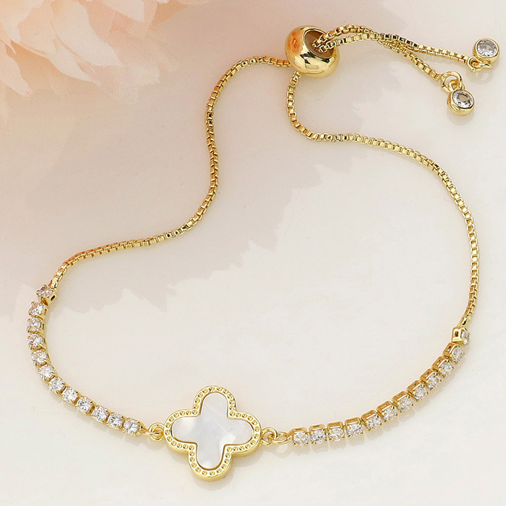iLLASPARKZ Mother Of Pearl Quatrefoil Pointed Brass Metal Round CZ Stone Adjustable Pull Tie Bracelet