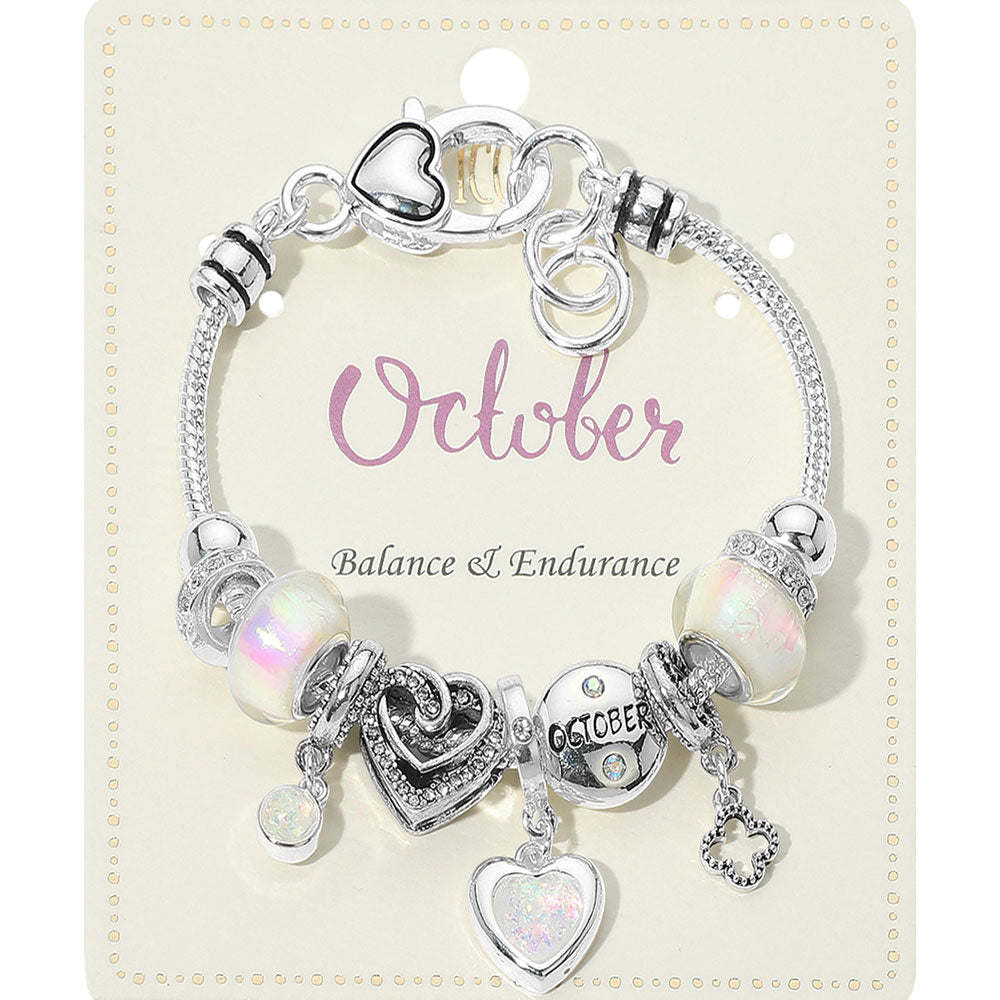 Elegant charm bracelet for October featuring heart charms and shimmering accents. Represents balance and endurance, making it a thoughtful gift or personal keepsake to honor your birth month in style.