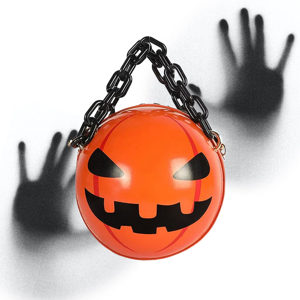 Celebrate spooky season in style with this pumpkin face round handbag featuring a striking expression and chunky chain strap. Perfect for Halloween parties, costumes, or themed accessories.