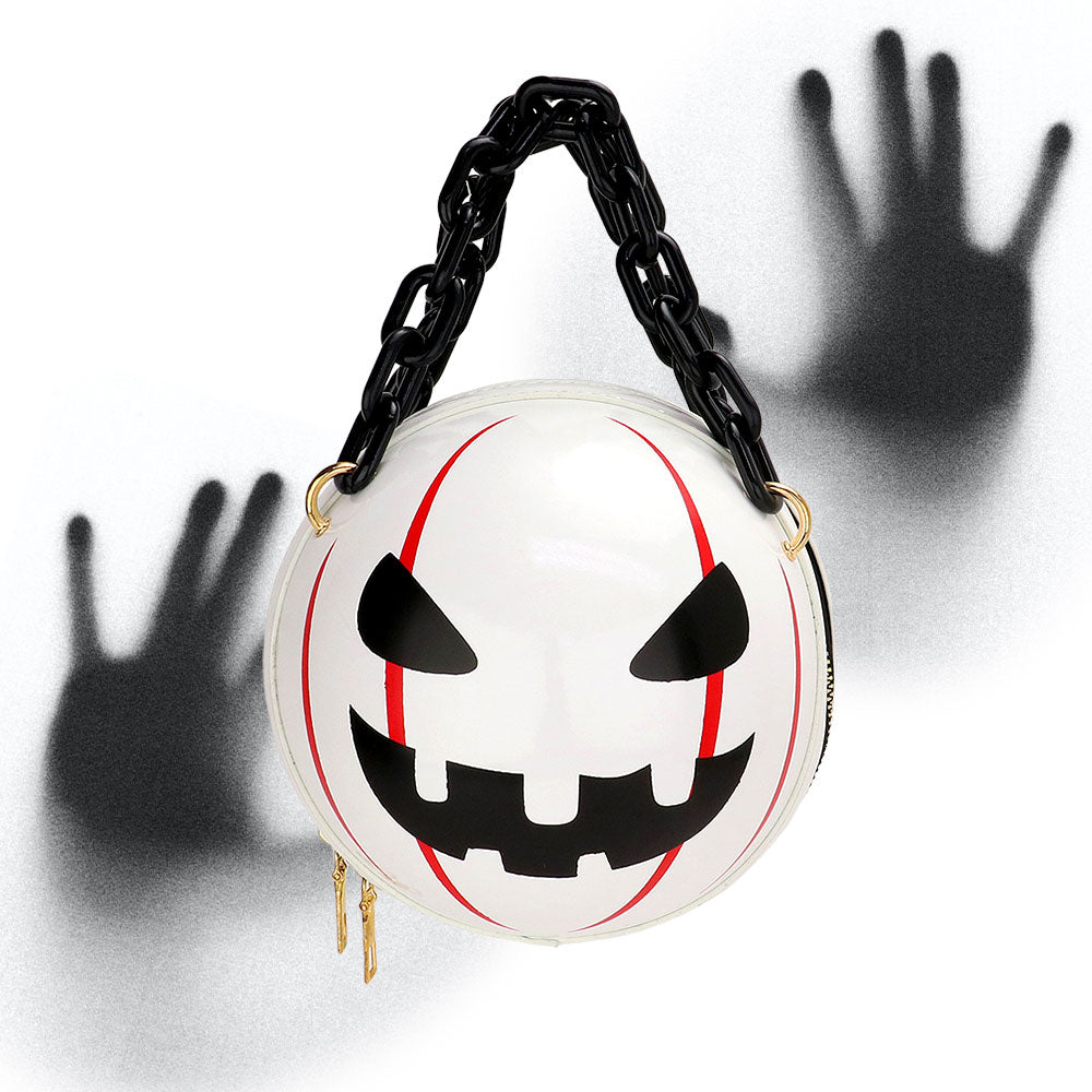 Add a spooky twist to your outfit with this round Halloween-themed handbag featuring a bold face design and chunky chain handle. Ideal for costume parties, trick-or-treating, or festive accessorizing.