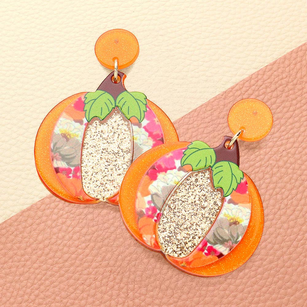 Add a festive touch to your autumn look with these charming pumpkin drop earrings featuring floral accents and a glitter center. Perfect for seasonal events, they blend whimsy and celebration into one playful accessory.