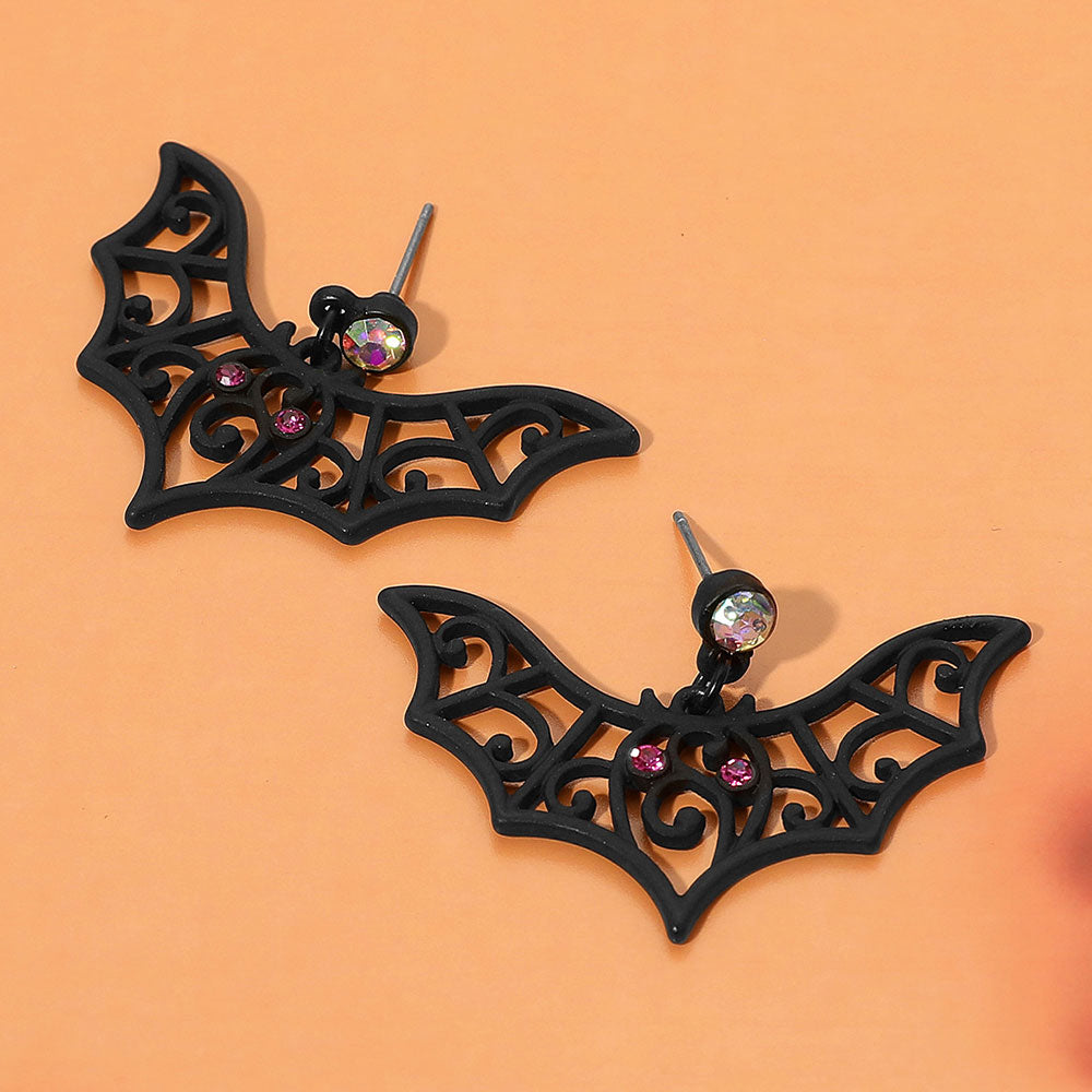 Add gothic charm to your Halloween look with these black filigree bat earrings. Featuring intricate wing details and sparkling rhinestones, they make the perfect spooky-chic accessory for parties, costumes, or festive fall fashion.