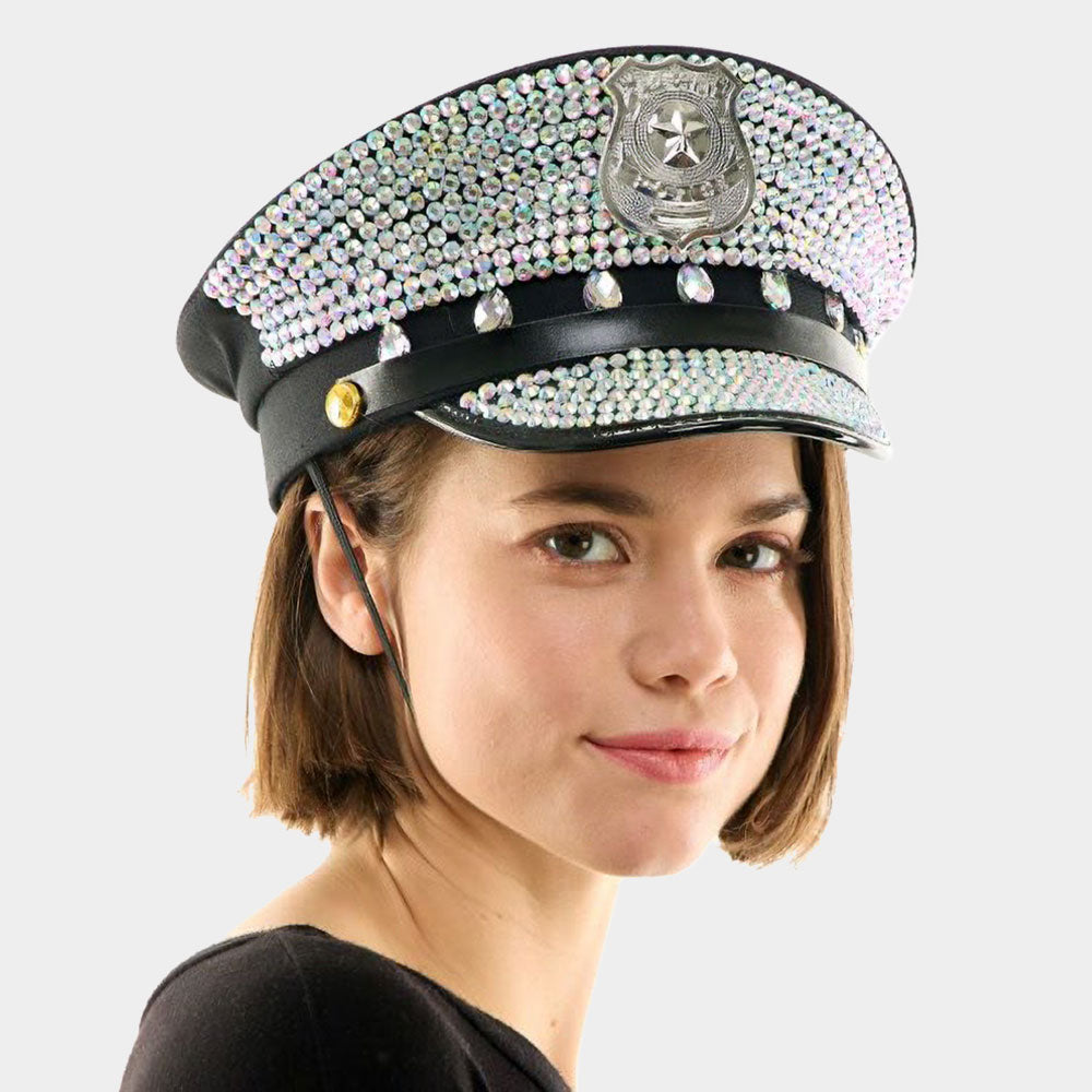 Eye-catching police-style hat adorned with shimmering rhinestones and a badge. Perfect for themed events, dance costumes, parades, or bold party wear.