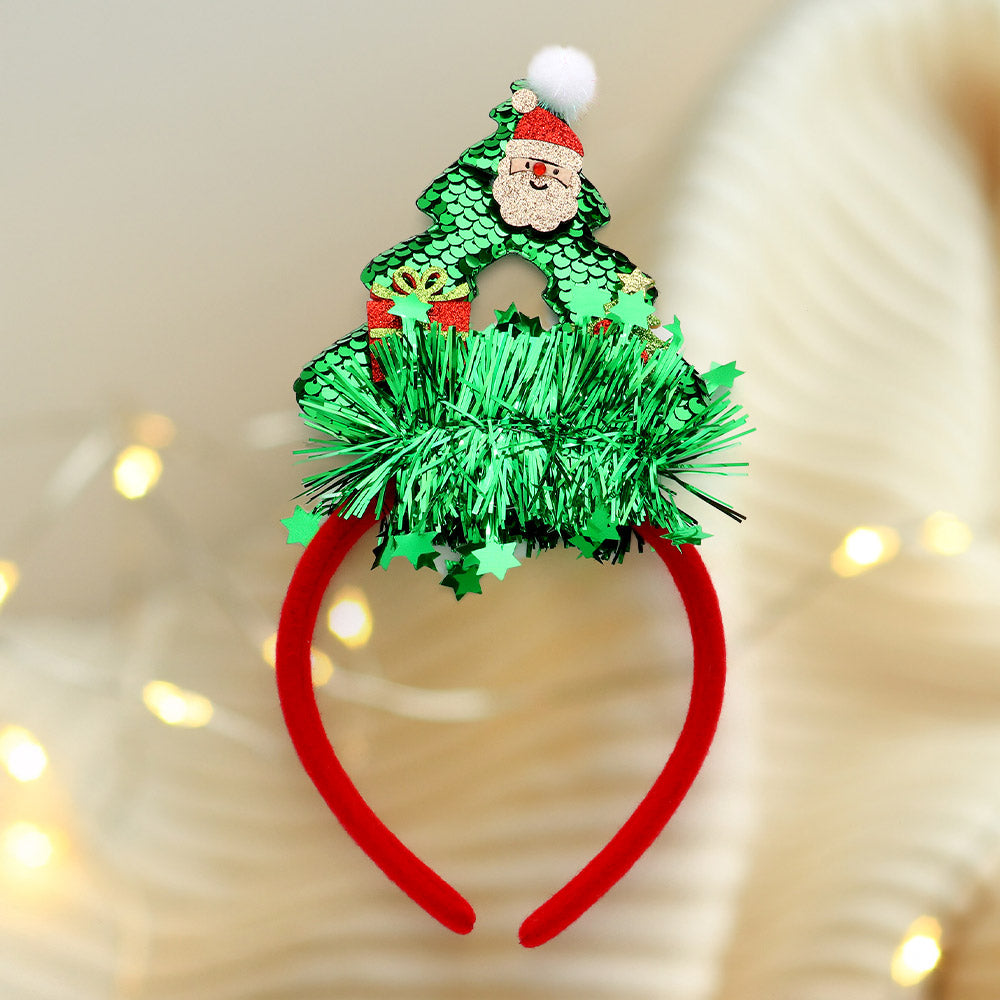 Festive novelty headband decorated with a Christmas tree, Santa figure, tinsel, and star accents. Fun holiday accessory for parties, celebrations, or seasonal photo shoots. Lightweight and comfortable to wear, this cheerful headband adds playful charm to Christmas outfits and makes a cute holiday gift.