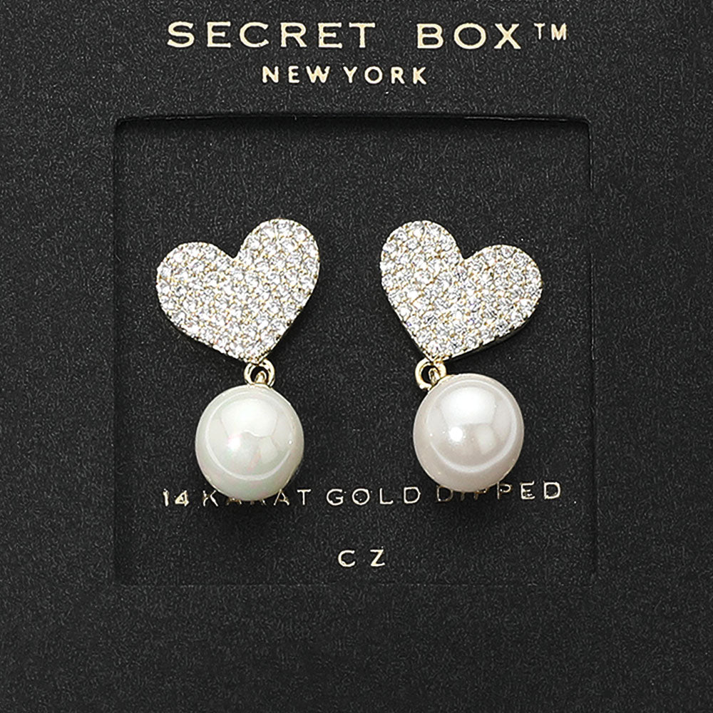 iLLASPARKZ SECRET BOX_14K Gold Dipped CZ Stone Paved Heart Accent Pearl Dangle Earrings
