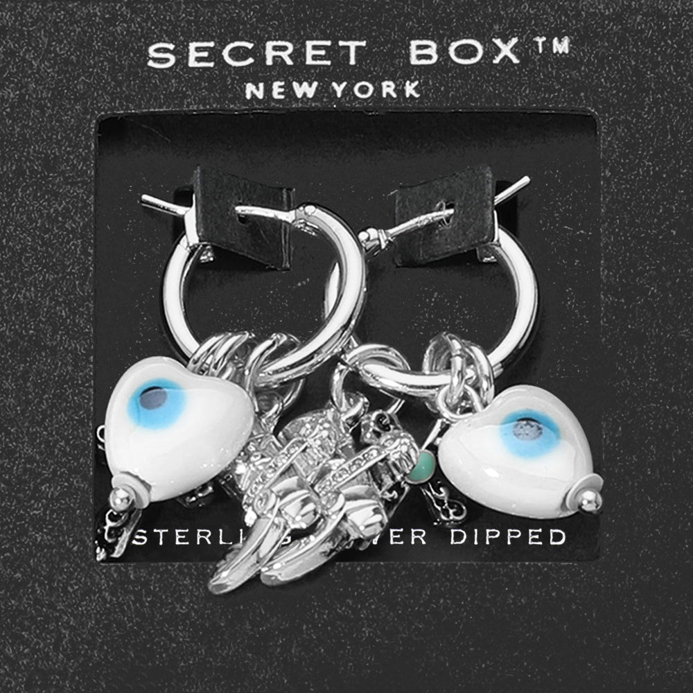 iLLASPARKZ SECRET BOX_Sterling Dipped Ceramic Evil Eye Heart Cross Western Boot Charm Dangle Pin Catch Hoop Earrings