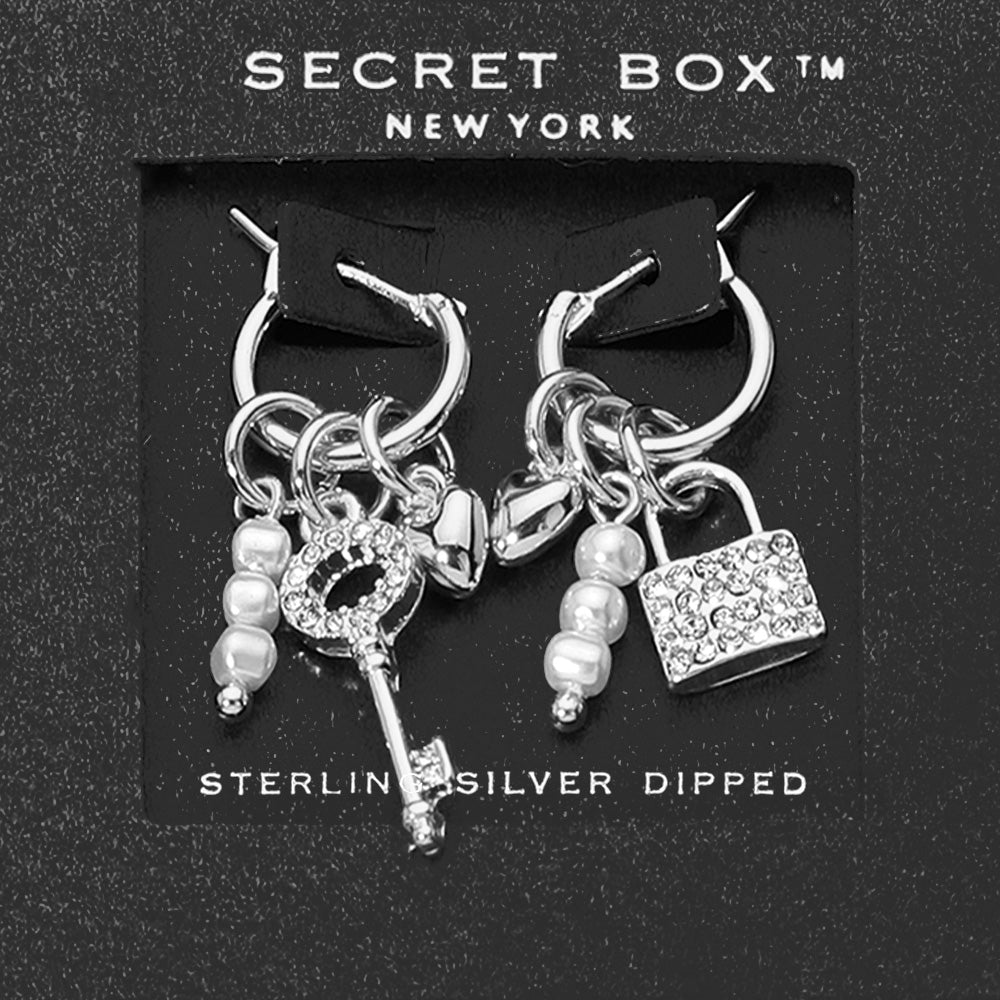 iLLASPARKZ SECRET BOX_Sterling Silver Dipped Pearl Cluster Key Lock Heart Charm Dangle Pin Catch Hoop Earrings