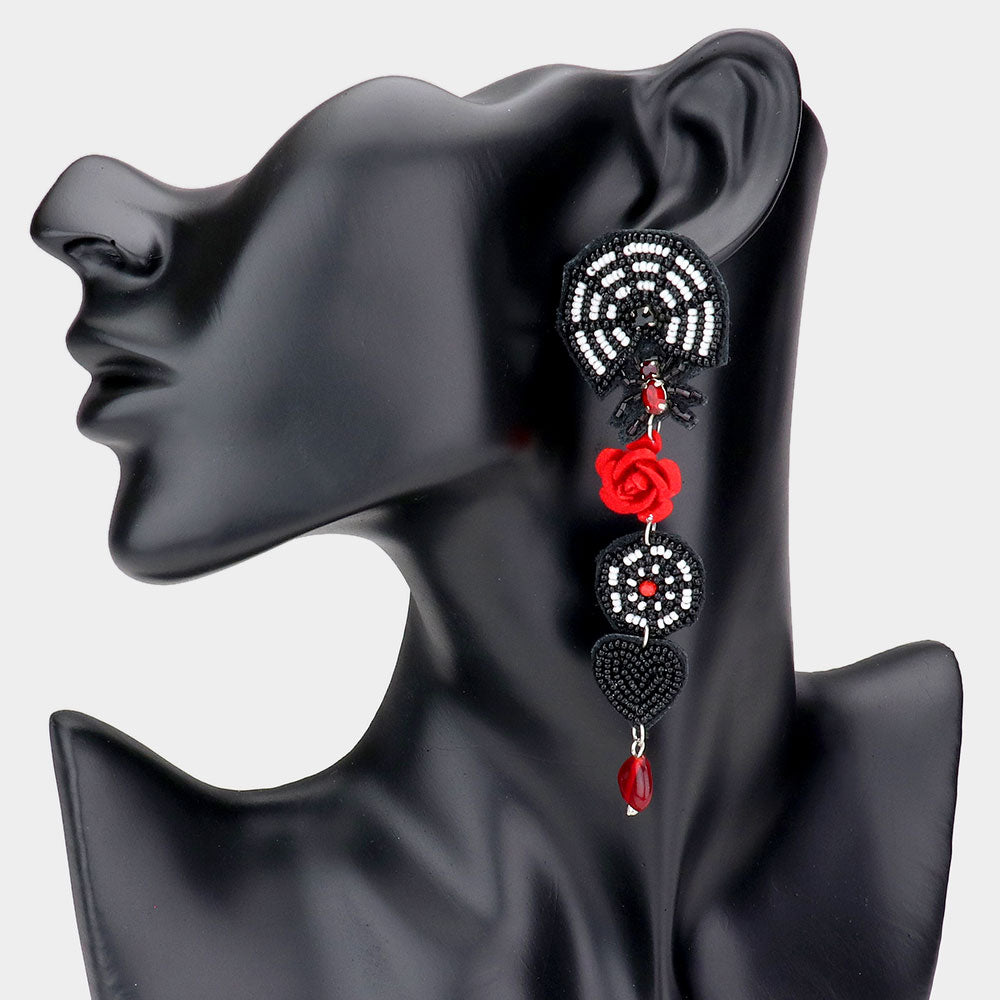 Long dangle earrings featuring spiderweb patterns, a rose accent, and heart details. A bold statement piece for Halloween outfits or gothic-inspired looks. Lightweight with secure fit for all-day wear.