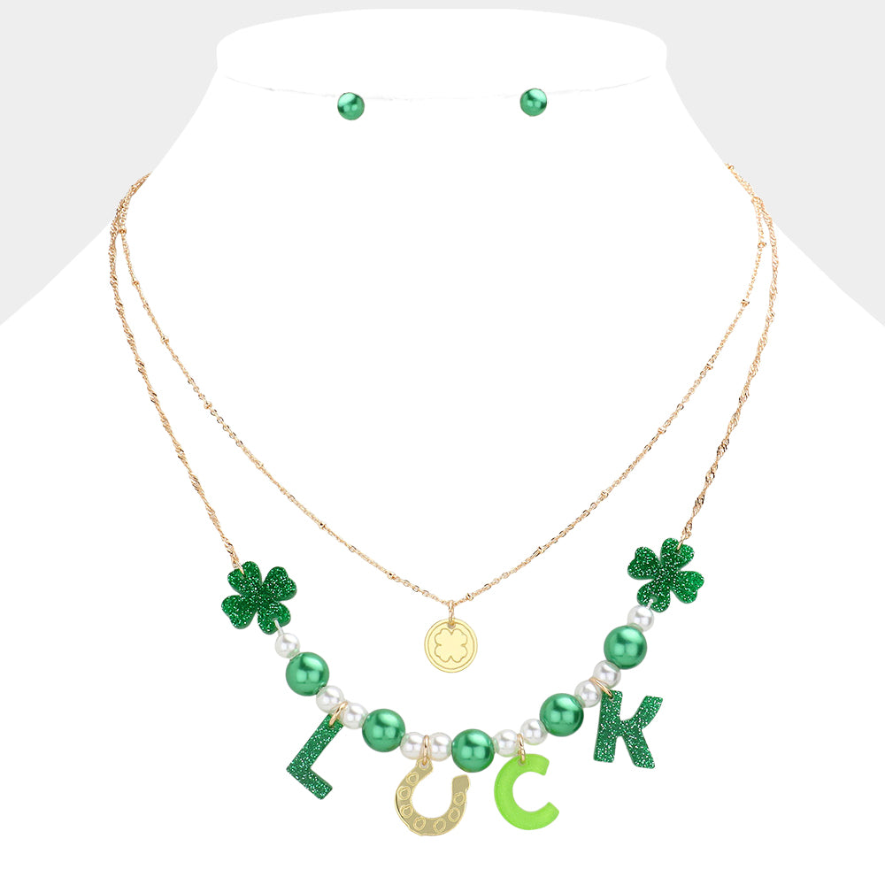 iLLASPARKZ St. Patrick's Day LUCK Message Glittered Resin Clover Horseshoe Pearl Double Layered Necklace