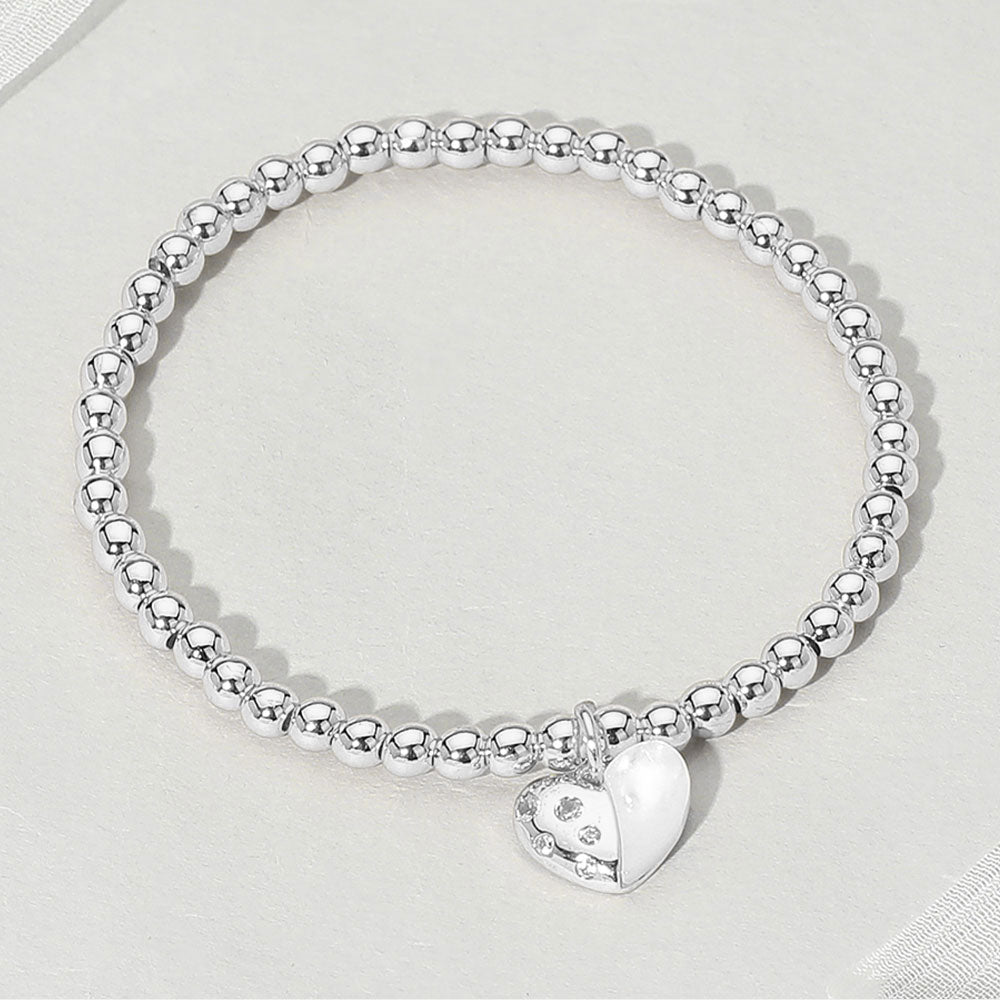 Elegant beaded bracelet featuring a heart charm adorned with a crystal-studded half and a smooth pearl finish. A timeless design perfect for romantic gifts or adding a charming detail to your look.