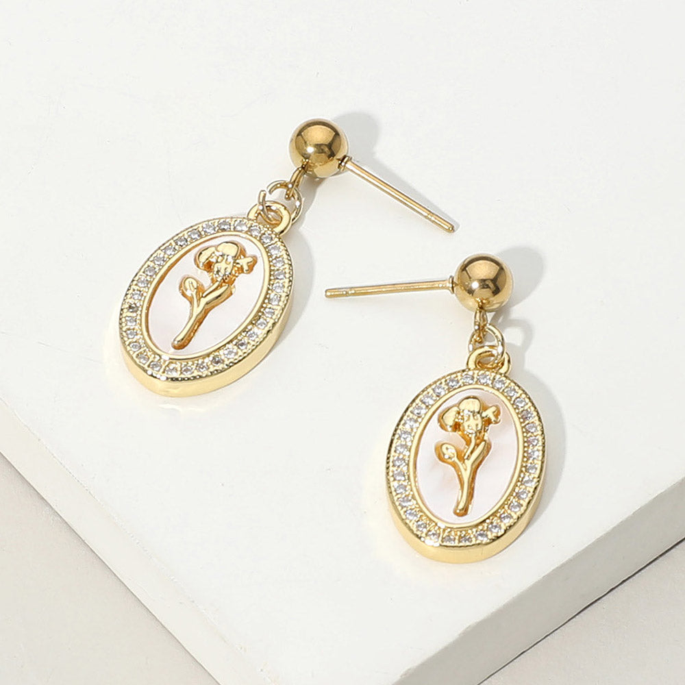 iLLASPARKZ Stainless Steel Stone Paved Tulip Flower Embossed Mother of Pearl Oval Dangle Earrings
