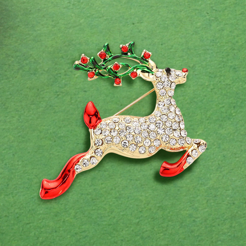 Add seasonal sparkle with this charming reindeer brooch, featuring shimmering accents and festively adorned antlers. A delightful piece to brighten up your holiday ensembles.