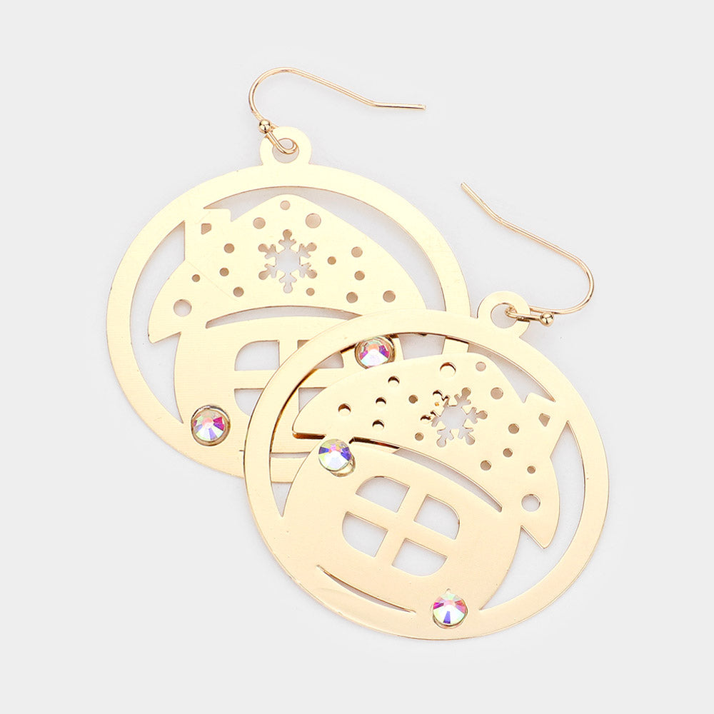 iLLASPARKZ Stone Embellished Cut Out Christmas House Brass Metal Round Dangle Earrings