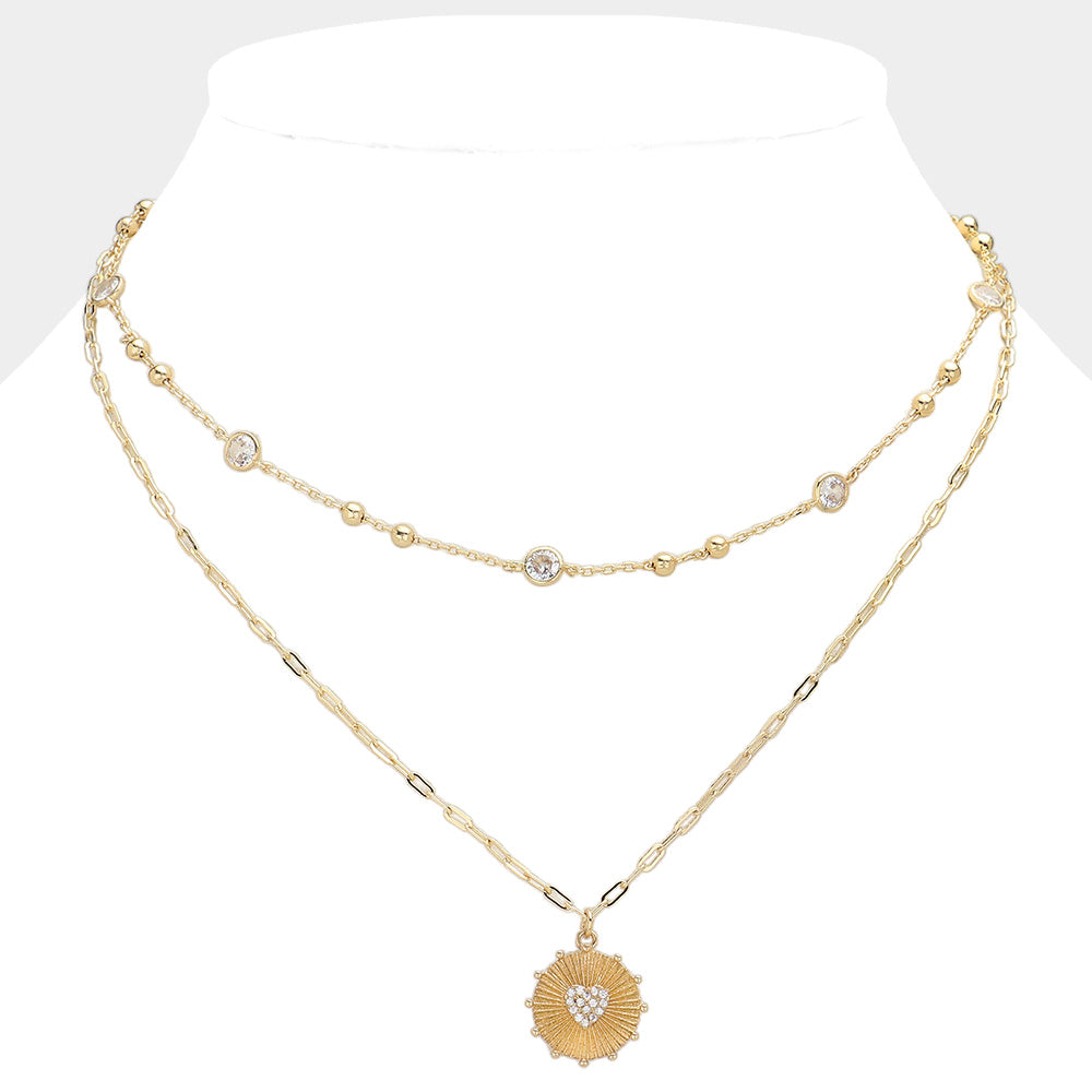 iLLASPARKZ Stone Paved Heart Poitned Disc Pendant Double Layered Necklace